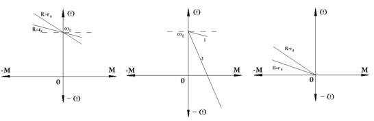 Рис. 10 Механические характеристики электродвигателя независимого возбуждения в тормозных режимах: а) генераторном; б) противовключением; в) динамическом.