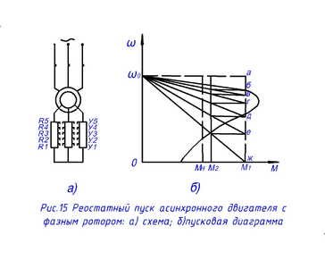 По мере нарастания скорости вращения электродвигателя сопротивление реостата постепенно уменьшается за счет переключения его ступеней. После окончания процесса пуска реостат замыкается накоротко, рис.15а.