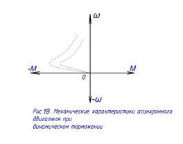Динамическое торможение. При динамическом торможении обмотки статора электродвигателя отключают от сети переменного тока и на одну из фаз подают напряжение от источника постоянного тока. Постоянный ток, протекая по обмоткам статора, создает в нем неподвижное магнитное поле, при пересечении которого во вращающих обмотках ротора наводится ЭДС имеющая переменный характер. Это ЭДС в обмотках ротора вызывает переменный ток, который взаимодействует с полем статора, создает тормозной момент. При полной остановке двигателя ЭДС в роторе равна нулю. Механические характеристики в режиме динамического торможения приведены на рис. 19.
