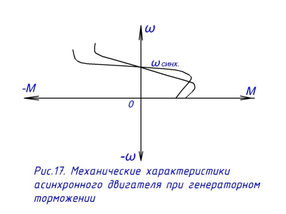 Механические характеристики расположены во втором квадранте и являются продолжением механических характеристик двигательного режима, рис.17. Достоинства рекуперативного торможения – возврат энергии в сеть, надежность; недостаток – невозможность торможения при
