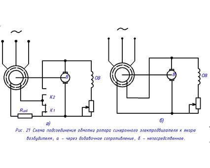 В процессе пуска обмотку возбуждения электродвигателя замыкают при помощи размыкающего контакта контактора К (рис. 21а) на активное сопротивление