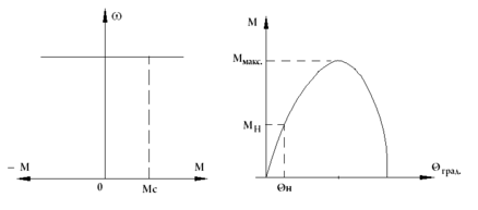 Рис. 20 Механическая характеристика (а) и угловая характеристика (б) синхронного электродвигателя.