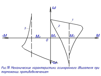 На рис.18. во втором квадранте показана механическая характеристика (3) для остановки механизма, полученная противовключением двигателя. Механическая характеристика (2), расположенная в четвертом квадранте, полученная при введении добавочного сопротивления, характерна для случаев опускания грузов.