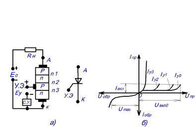 Рис.4. Структура тиристора: а) обозначение на схеме; б) вольт-амперная характеристика