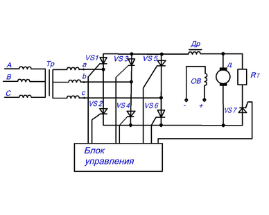 Для остановки электродвигателя тиристоры VS1÷VS6 запираются, а тиристор VS7 открывается, замыкая якорь двигателя на тормозное сопротивление Rт.