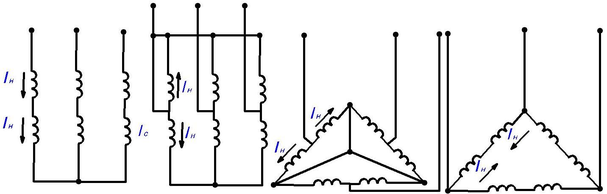 На рис.7б приведены схемы треугольник — двойная звезда (∆/YY). Здесь при большем числе полюсов обе части фазной обмотки включены последовательно, а фазные обмотки соединяются треугольником. При вдвое меньшем числе полюсов питающие провода подводятся к середине сторон треугольника, а его углы соединяются в одной точке. Таким образом, получается схема двойной звезды.