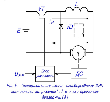 Схема нереверсивного ШИП постоянного напряжения рис 7 состоит из электронного ключа, дросселя и обратного диода. В схеме в качестве ключа в зависимости от мощности применяют транзисторы или тиристоры. В схеме, приведённой на рис.6, принят тиристор, а между ним и нагрузкой включена индуктивностьL. При отпирании тиристора V1по индуктивностив нагрузку протекает ток iн (на рис.6, а путь тока показан сплошной линией), при этом сердечникLнамагничиваясь запасает энергию. При запирании тиристора ток в нагрузке iн2 (путь тока показан пунктирной линией) за счет э. д. с. самоиндукции L сохраняет свое прежнее направление, замыкаясь через обратный диод V2 на начало индуктивности. При открытом тиристоре диод закрыт. Эпюры напряжений и токов в схеме показаны на рис.6, б.