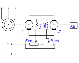 Система Г-Д, рис. 3а служит для реализации регулирования скорости изменением подводимого напряжения к якорю двигателя и позволяет получить плавное регулирование скорости в широких пределах. Якорь генератора Г вращается с постоянной скоростью двигателем переменного тока – синхронным или асинхронным электродвигателем. Напряжение на щетках генератора изменяется с помощью магнитного потока генератора за счет изменения тока в его обмотке возбуждения (ОВГ) сопротивлением Rовг практически от нуля до номинального, так как