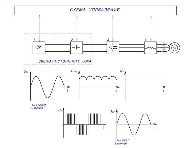 Таким образом, на выходе преобразователя частоты формируется трехфазное (или однофазное) переменное напряжение изменяемой частоты и амплитуды (Uвых = var, fвых = var).