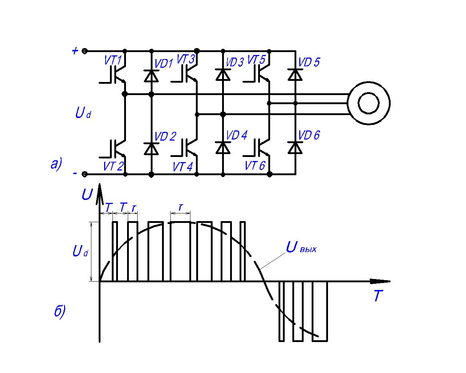 Uвых = Ud(τ/Т). В этом уравнении период повторения импульсов Т=const, а τ=var. При модуляции (регулировании) τ изменяют от 0 до Т, что обеспечивает изменение Uвых по синусоидальному закону (рис. 10б) в функции изменения τ, которую, в соответствии с программой задаёт система управления обычно выполняемая на микропроцессорах.