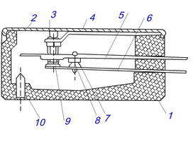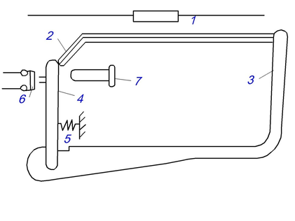 После того, как тепловое реле срабатывает, его необходимо установить в нормальное положение, при котором биметаллическая пластинка 2 упирается в рычаг 4. Для этого в аппарате предусмотрена кнопка 7, нажатием которой осуществляется ввод реле.