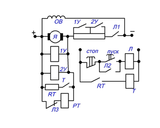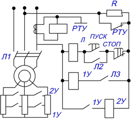 При пуске двигателя линейный контактор подключает контактом Л1 обмотку статора к сети при полном сопротивлении в цепи ротора. При возникшем броске тока в статоре срабатывает реле РТУ и размыкает свой контакт в цепи контактора Л, но он не отключается, т.к. сопротивление R подобрано такой величины, что ток в катушке контактора достаточен для удержания его в рабочем состоянии. По обмотке контактора 1У тоже потечет ток, но он окажется недостаточным для его срабатывания.
