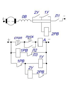 При включении контактора его блок-контакторЛ3 разомкнет цепь реле 1РВ, которое потеряв питание с выдержкой времени, необходимой для пуска двигателя на первой ступени, замкнет свой контакт 1РВ в цепи контактора 1У, который, включившись, зашунтирует первую ступень сопротивления и двигатель начинает разгон на следующей искусственной характеристике. При этом закорачивается катушка реле 2РВ, оно обесточивается и с выдержкой времени своими контактами подает питание на контактор 2У. Контактор 2У включается и шунтирует вторую ступень пускового сопротивления. Двигатель включается на полное напряжение и начинает работать на естественной механической характеристике.