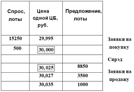 В приведённом примере заявкой с лучшей ценой на покупку является лимитированная заявка на покупку с наибольшей ценой (в табл. 2 – заявка с ценой 30,000 руб.). Заявкой с лучшей ценой на продажу является лимитированная заявка на продажу с наименьшей ценой (в табл. 2 – заявка с ценой 30,025 руб.). Между лучшими ценами на покупку и продажу имеется некоторый ценовый промежуток, именуемый спрэдом (в табл. 2 – 0,025 руб.).