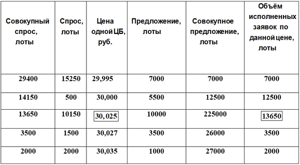 1) для каждого значения цены в поданных заявках на покупку (в порядке убывания цен, в табл. 1 – снизу-вверх) рассчитывается нарастающим итогом совокупный (агрегированный) спрос. Этот спрос представляет собой объём заявок (в лотах) на покупку, который может быть удовлетворён по соответствующей цене;