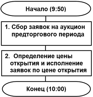 Целью краткосрочного предторгового периода является определение цены открытия текущего торгового дня. Схема алгоритма предторгового периода (аукциона открытия) представлена на рис. 3. В течение предторгового периода реализуется дискретный двойной аукцион с одномоментной фиксацией цены из условия максимального объёма (call auction – type trading). В ходе рассматриваемого аукциона его участники (продавцы и покупатели) вводят в торговую систему лимитированные заявки на покупку или продажу интересующих их акций. Эти заявки, накапливаясь, ранжируются по ценам и последовательности поступления, но до момента истечения предторгового периода не исполняются. На последней секунде этого периода (в 10:00) торговая система определяет по каждой ценной бумаге ту цену (из всех заявленных участниками), которая обеспечивает удовлетворение наибольшего объёма