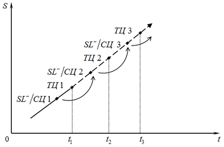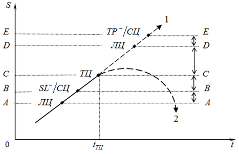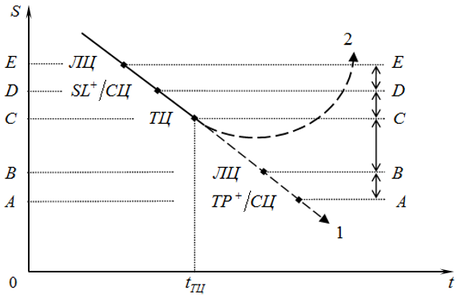 открыл «длинную» позицию с текущей ценой ТЦ1 (рис. 8). Для управления ценовым риском брокеру была подана заявка StopLoss на продажу с сигнальной ценой СЦ1.