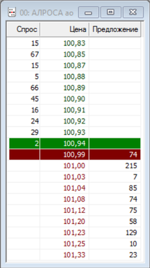 На рис. 4 видно, что окно «Котировки» (трейдеры его называют «стаканом») делится по горизонтали на две половины: верхнюю и нижнюю. В верхней половине представлены нереализованные лимитированные заявки на покупку с десятью ценами, наиболее близкими к ценам продавцов (зелёный цвет). В нижней половине представлены нереализованные лимитированные заявки на продажу с десятью ценами, наиболее близкими к ценам покупателей (красный цвет). Лучшие цены на покупку и продажу (100,94 и 100,99 руб.) расположены в полях, выделенных соответственно зелёным и красным цветом. При этом спрэд составляет 0,05 руб. (примерно 0,05 % текущей рыночной цены). Окно «Котировки» имеет три вертикальных колонки. В средней колонке показаны заявленные лимитированные цены одной акции в рублях. Все цены ранжированы по возрастанию сверху вниз. Во внешних колонках приведён совокупный объём заявок в лотах для каждой из цен. Заявки на покупку в очереди представляют собой спрос (рынка), а заявки на продажу – предложение (рынка).