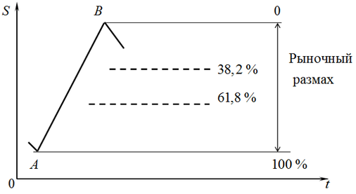 Для определения величин коррекционных волн на рынке многие аналитики используют уровни Фибоначчи (рис. 22). Эти уровни имеют следующие значения относительно рыночного размаха: 23,6 %, 38,2 %, 61,8 %, 100 %, 161,8 %.