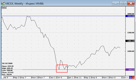 Вторая группа методов основана на выявлении характерных фигур на графиках изменения цен. Таких фигур к настоящему времени описано более трёхсот. По этим фигурам устанавливаются тенденции изменения цен (тренды) и определяются поворотные моменты. Так, например, считается, что повторяющиеся фигуры на графике свидетельствуют о близком значительном изменении цен. Идентификация фигур, особенно сложных, – очень субъективный процесс, поскольку отражает лишь мнение конкретного аналитика. Описание различных фигур, методы их использования в техническом анализе приведены в [3−8, 10]. В качестве примера на рис. 20 показана фигура «Двойное дно» на графике фондового индекса ММВБ (выделена прямоугольником). Эта фигура свидетельствовала об окончании кризисного падения фондового рынка в конце 2008 года.