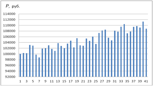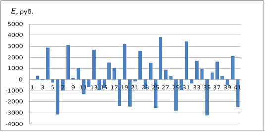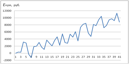). Анализ табл. 4 и рис. 33 показывает, что на 41-й торговый день итоговая прибыль по портфелю составила 8832,07 руб. Проверяем выполнение неравенства (7):