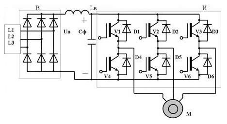 и шести IGBT-транзисторов V1-V6, включенными встречно-параллельно диодами обратного тока D1-D6, образующими каскад инвентора.