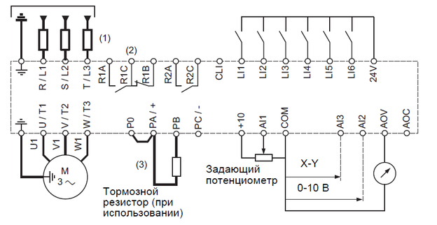 | U/T1 V/T2 W/T3 | Подключение обмоток двигателя |