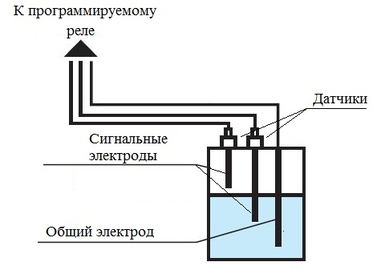 В комплекте с датчиком необходимо иметь сигнализиррующий электрод. Принцип действия датчика основан на изменении электропроводности между общим и сигнальными электродами в зависимости от уровня сигнализируемой жидкости. Схема установки датчиков уровня изображена на рисунке 2.16.