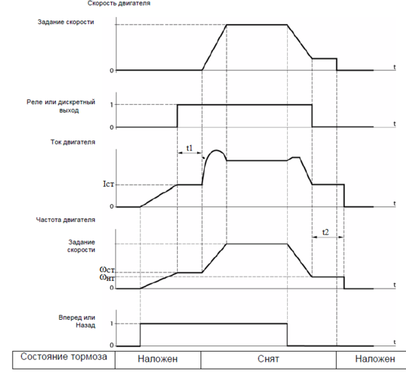 В начальное время тормоз наложен на двигатель. При подаче команды вперед или назад тормоз не снимается, пока не будет достигнут необходимый пусковой момент. Когда ток достигает значения тока снятия тормоза