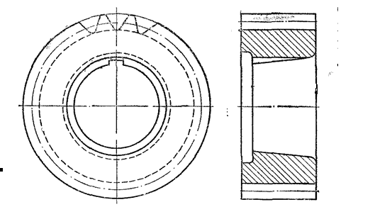 Зубчатая передача электровоза ЭС5К жесткая косозубая двусторонняя. Малая шестерня изготовлена из поковки хромо-никелевой стали марки 20ХНЗА. После механической обработки шестерню подвергают нитроцементации на глубину 1,6—2,4 мм и закалке. Для насадки шестерни на вал тягового двигателя она имеет коническое отверстие (конусность 1 : 10); на конической поверхности есть канавка шириной 20 мм для направляющей шпонки, а на торце шестерни — выточка для гайки, предохраняющей шестерню от сползания с конца вала. Перед насадкой конические поверхности вала и шестерни притирают так, чтобы общая поверхность контакта была не менее 85% (проверяют путем нанесения краски). Малая шестерня представленная на рисунке 1.4.