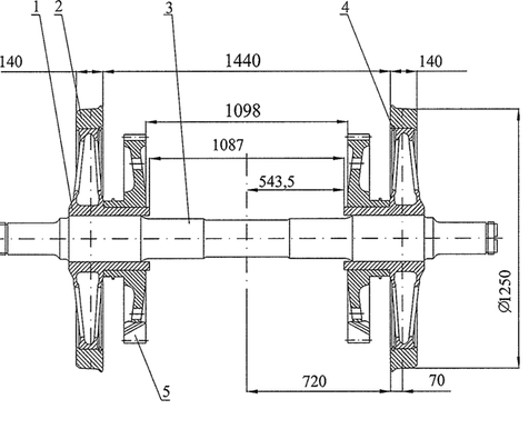1 – колесный центр; 2 – бандаж; 3 – ось; 4 – колесо бандажное; 5 – колесо зубчатое.