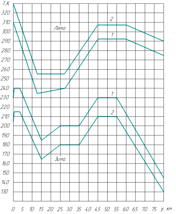 Например для кривых 1 и 2 можно рассчитать массивы данных для атмосфер зима 1 и 2 (W1 и W2) и лето (S1;S2), где hꓥ - геометрическая высота, TW1 и TW2; TS1 и TS2, dTW и TS.