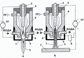 Рис. 59С. Схема плазменной сварки а – плазменная сварка дугой косвенного действия; б – плазменная сварка дугой прямого действия. 1 – дуга, 2 – вольфрамовый неплавящийся электрод, 3 – керамический изолятор, 4 –основное сопло плазмотрона, 5 – плазма, 6 –сменная насадка плазмотрона, 7 – свариваемое изделие, 8 – устройство для зажигания маломощной вспомогательной дуги, ПГ – плазмообразующий газ; ЗГ – защитный газ.. При плазменной сварке источником теплоты является плазма. Плазменная струя, применяемая для сварки, представляет собой направленный поток ионизированного газа, имеющего температуру 20 000–30 000С. Плазму получают в плазменных горелках (плазмотронах), пропуская плазмообразующий газ (ПГ) через столб горящей дуги 1, сжатой в узком канале сопла горелки 4. Сжатие столба дуги приводит к повышению в нём плотности энергии и температуры. Плазмообразующий газ, проходящий через столб дуги, ионизируется и выходит из сопла в виде высокотемпературной плазменной струи. В зависимости от процесса обработки и вида обрабатываемого материала в качестве плазмообразующих газов применяют азот, аргон, водород, гелий, воздух или их смеси. Применяются два основных вида плазменной сварки, в одном из которых в качестве источника нагрева заготовки используется плазменная струя (рис. 59С, а), выделенная из столба косвенной дуги, а в другом – плазменная дуга (рис. 59С, б), т.е. дуга прямого действия, совмещённая с плазменной струёй. При сварке плазменной струёй (плазменная сварка дугой косвенного действия) (рис. 59С, а) дуга 1 горит между неплавящимся вольфрамовым электродом 2, изолированным от корпуса горелки 9 керамической прокладкой 3, и интенсивно охлаждаемым водой соплом 4, к которому подключён положительный полюс источника тока 10. Внутрь горелки подаётся плазмообразующий газ (ПГ), который, пройдя через столб дуги, ионизируется, нагревается и выходит из сопла в виде ярко светящейся плазменной струи 5, которая представляет собой независящий от заготовки источник теплоты, позволяющий в широких пределах изменять степень нагрева и глубину проплавления основного материала 7. Через сменную насадку 6, концентрически охватывающую основное сопло 4, в зону сварки дополнительно подаётся защитный газ (ЗГ). При сварке плазменной дугой (плазменная сварка дугой прямого действия) (рис. 59С, б) устройство горелки принципиально не отличается от рассмотренного. Но при такой сварке дуга горит уже не между электродом и соплом, а между электродом и заготовкой, к которой в этом случае и подключён положительный полюс источника тока. Лишь в самом начале процесса для облегчения зажигания основной дуги с помощью устройства 8 возбуждается маломощная вспомогательная дуга между электродом и соплом, к которому кратковременно подводится ток, выключаемый сразу же после того, как возникшая плазменная струя коснётся заготовки и зажжётся основная дуга. Сварка выполняется на постоянном токе прямой полярности. ОСНОВНЫЕ ПАРАМЕТРЫ СВАРКИ Основными параметрами плазменной сварки являются: величина сварочного тока, род и полярность тока, диаметр неплавящегося (вольфрамового) электрода, напряжение сварки, расход плазмообразующего газа, расход защитного газа, скорость сварки Vсв,. |