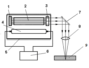 Рис. 63С. Схема твердотельного лазера с оптической накачкой рабочего вещества. | 1.Непрозрачное (глухое) зеркало 2. Рабочее вещество (активный элемент) 3. Полупрозрачное зеркало 4. Лампа накачки 5. Отражатель корпуса. 6. Высоковольтный источник питания 7. Отражающее зеркало. 8. Фокусирующая линза 9. Обрабатываемый материал |