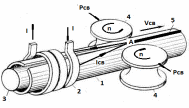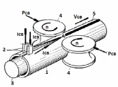 Рис. 78С. Кондукционная схема токоподвода Трубная заготовка, имеющая зазор между кромками, зажимается в обжимных валках 4 с усилием Рсв. Под действием усилия сжатия зазор между кромками приобретает V-образную форму с вершиной в точке А, где обеспечивается контакт кромок. Валки 4 приводятся во вращение и перемещают исходную заготовку со скоростью Vсв. Ток Iсв, поступающий от высокочастотного генератора, подводится к кромкам свариваемого изделия через скользящие токоподводящие контакты 2. Проходя по периметру заготовки и встречая зазор между свариваемыми кромками, ток отклоняется к точке схождения кромок А (вершина V-образного зазора). В точке А создается максимальная концентрация энергии, что обеспечивает быстрый нагрев металла до температуры термопластического состояния (температура, при которой обеспечивается необходимая пластичность металла). Наличие ферритового сердечника 3 способствует большей концентрации энергии в кромках заготовки и тем самым уменьшает ширину зоны их разогрева. Обжимные ролики 4, одновременно с перемещением свариваемого изделия со скоростью сварки Vсв, обеспечивают сжатие нагретых кромок заготовки с усилием Рсв, что способствует формирование сварного шва 5 и образованию сварного соединения. |