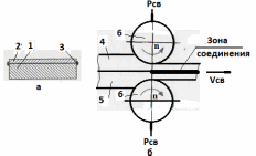 Рис. 85С. Исходная заготовка для сварки биметалла прокаткой (а) и схема сварки прокаткой (б) Сварка прокаткой, как правило, применяется для получения биметаллических (многослойных) изделий. Такие изделия состоят из основы 1 (основной металл), обеспечивающей необходимую конструкционную прочность, и рабочего (плакирующего) слоя 2 с особыми свойствами (жаростойкость, жаропрочность, коррозионная стойкость и т.д.) (рис. 85С, а). Горячую сварку прокаткой выполняют с предварительным нагревом пакетов в специальных нагревательных печах. Для уменьшения степени окисления поверхностей заготовок перед нагревом пакеты герметизируют сварным швом 3 по периметру (рис. 85С, а), а в ряде случаев сварку прокаткой производят в защитной атмосфере (вакууме или инертном газе). Холодную сварку прокаткой применяют для получения двух- или трехслойных биметаллов, состоящих из стальной основы и плакирующих слоев из цветных металлов, например сталь + медь, сталь + латунь, медь + алюминий, алюминий + титан, алюминий + сталь + алюминий. Сварка прокаткой выполняется следующим образом (рис. 85С, б). Поверхности соединяемых слоев перед сваркой тщательно зачищают. Пакет, состоящий из слоев 4 и 5, помещается между валками прокатного стана 6. К валкам прикладывается усилие Рсв и ролики приводятся во вращение, сообщая свариваемым заготовкам заданную скорость перемещения Vсв. Соединение компонентов биметалла происходит при их совместной горячей или холодной пластической деформации. ОСНОВНЫЕ ПАРАМЕТРЫ СВАРКИ Основными параметрами сварки прокаткой являются: усилие (давление) прокатки, скорость прокатки, температура прокатки. |