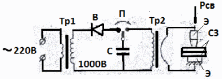 Рис. 80С. Схема трансформаторной конденсаторной сварки В левом положении переключателя П конденсатор С заряжается от источника постоянного тока В (выпрямитель), подключенного во вторичную обмотку повышающего трансформатора Тр1.. При переводе переключателя П в правое положение происходит разряд конденсатора С на первичную обмотку понижающего сварочного трансформатора Тр2. При этом, во вторичной обмотке трансформатора, связанной с электродами сварочной машины Э индуктируется сварочный ток Iсв большой силы, обеспечивающий сварку предварительно сжатых усилием Рсж свариваемых заготовок СЗ. Трансформаторная конденсаторная сварка предназначена в основном для точечной или шовной сварки, но может быть использована и для стыковой. Циклограмма трансформаторной конденсаторной сварки представлена на рис. 81С. | ||