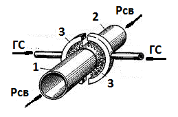 Рис. 84С. Схема газопрессовой сварки | Свариваемые детали 1 и 2 в месте их соединения (стыка) нагреваются специальной разъемной многопламенной газокислородной горелкой 3, в которую подается горючая смесь (ГС) – смесь технически чистого кислорода и горючего газа ацетилен, метан, пропан-бутановую смесь и др). Сопрягаемые поверхности нагреваются до пластического состояния или до оплавления кромок. После достижения в месте стыка заданной температуры свариваемые элементы сдавливаются внешним усилием Рсв. |