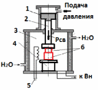 Рис. 82С. Схема диффузионной сварки При диффузионной сварке сварное соединение образуется в результате взаимной диффузии атомов в поверхностных слоях контактирующих материалов, находящихся в твердом состоянии. Свариваемые заготовки 6 с тщательно зачищенными свариваемыми поверхностями помещаются на стол 4, находящийся в водоохлаждаемой рабочей камере 3. В рабочей камере создается разрежение 10‾5мм рт. ст. в результате откачки атмосферного воздуха вакуумным насосом Вн. Для повышения пластичности и ускорения процесса диффузии свариваемые заготовки 6 нагреваются до температуры Тн = 600 — 800°С нагревательным устройством 5 и к ним, с помощью штока 2 пневмо- или гидроцилиндра 1, прикладывается небольшое сдавливающее усилие Рсв. Продолжительность процесса сварки составляет около 5мин. В результате нагрева свариваемых деталей в вакууме происходит интенсивное очищение поверхностей от окислов и органических загрязнений. Сварные швы, полученные в результате диффузионной сварки, обладают высоким качеством и не имеют внутренних напряжений. Циклограмма процесса диффузионной сварки представлена на рис. 83С. |