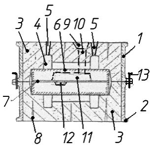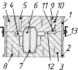 Литниковая чаша 9, стояк 10, шлакоуловитель 11 и питатель 12 образуют литниковую систему.