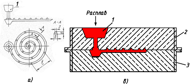 | спираль 1 формируется в литейной форме, состоящей из верхней 2 и нижней 3 полуформ (рисунок 3.1,б) после заливки в нее расплавленного металла. Жидкотекучесть оценивается по величине l (рисунок 3.1,а). Чем больше l , тем лучше жидкотекучесть. При низкой жидкотекучести в отливке могут возникать такие дефекты, как недоливы и спаи. Рисунок 3.1 - Технологическая проба (спираль) 1 - спираль; 2 - верхняя полуформа; 3 - нижняя полуформа |