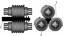 Рис. 17Д. Поперечная прокатка винтов | 1 – прокатываемый винт; 2 – валки. Выполняется в горячем состоянии. | ||