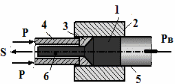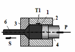 | При прямом прессовании направление выдавливания металла S совпадает с направлением движения пуансона 4 под действием силы Р. При этом пуансону приходится преодолевать не только сопротивление обрабатываемого материала пластическому формоизменению, но и силу контактного трения Т1, противодействующую проталкиванию исходной заготовки 1 относительно стенок контейнера 2. Недостатки: большие силы трения. Для снижения сил трения применяется смазка стенок контейнера и поверхности исходной заготовки (графит, жидкое стекло) | |