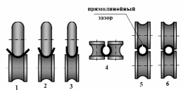 Рис. 14Д Процесс получения прямошовной сварной трубы. 1,2,3,4,5,6 - переходы Сварные трубы изготовляют из листа или полосы (ленты), называемой штрипсом. Процесс изготовления сварной трубы включает свёртывание полосы в трубу, называемое формовкой трубы, и сварку её кромок (на переходе 6 после выхода из клети). Сварные трубы получают на трубопрокатных станках как в горячем, так и в холодном состояниях. |