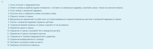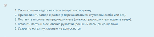- полная разборка применяется для чистки при сильном загрязнении пистолета, после нахождения его под дождем или в снегу, при переходе на новую смазку и при ремонте.)