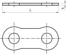 | Рис. 1.13. Пластина тяжелонагруженной приводной роликовой цепи эскалатора: а – общий вид фрагмента приводной цепи; б – эскиз пластины | |