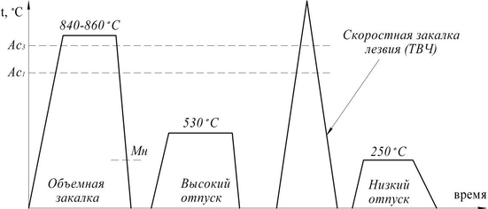 В результате для стали 6ХС рекомендуется использовать комбинированную упрочняющую термическую обработку, гарантирующую получение высокой твёрдости лезвия (53…56 HRC) и твёрдости полотна и обуха топора не более 45 HRC. Топор может выдерживать ударные нагрузки уровня 39 Дж/см2 при эксплуатации в условиях 20 °С и до 21 Дж/см2 при температурах до –60 °С. Полная схема разработанной упрочняющей термической обработки стали 6ХС представлена на рисунке 2.2. Она включает объёмную закалку при температуре 840…860°C, охлаждение в масле, высокий отпуск при 520- 540°С с ускоренным охлаждением, закалку лезвия топора с нагревом ТВЧ, отпуск при 250°С.