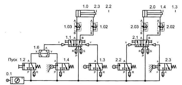 Для иллюстрации проблемы совпадающих шагов рассмотрим пневмопривод сверлильного полуавтомата (рис. 1.14).