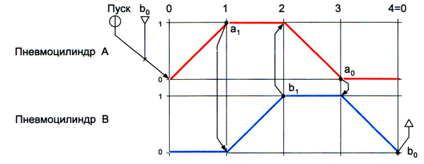 На диаграмме слева от каждой графической строки проставляют индекс устройства, изменение состояний которого она отображает (пневмоцилиндры А и В).