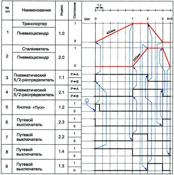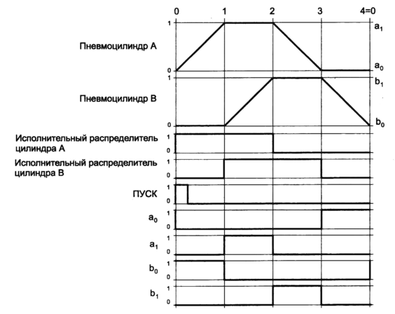 В области над верхней графической строкой диаграммы проставляют последовательную нумерацию состояний устройств пневмосистемы перед каждым из шагов и после него (в нашем случае от 0 до 4). После окончания полного рабочего цикла, чему соответствует состояние с номером 4, система возвращается в исходное состояние с номером 0.